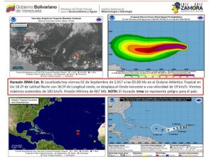 “Huracán mayor IRMA asciende a categoría 5, según la Administración Nacional Oceánica y Atmosférica (NOAA), se ubica a unos 900 Km de Venezuela. No representa peligro al país”, escribió Inameh en la red social Twitter.