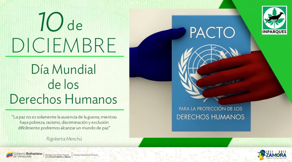 Prensa  Inparques / Puerto La Cruz, 10/12/2017.- Designada por la Organización de las Naciones Unidas (ONU), como la fecha en la que se lucha por los derechos propios y del prójimo, el 10 de diciembre de cada año se conmemora el Día Mundial de los Derechos Humanos, gracias a la firma de su declaración universal en el año 1948, y desde el Instituto Nacional de Parques (Inparques), ente adscrito al Ministerio del Poder Popular para Ecosocialismo y Aguas (Minea), se exhorta a todas y todos a profundizar el conocimiento de este importante hecho para la paz mundial.