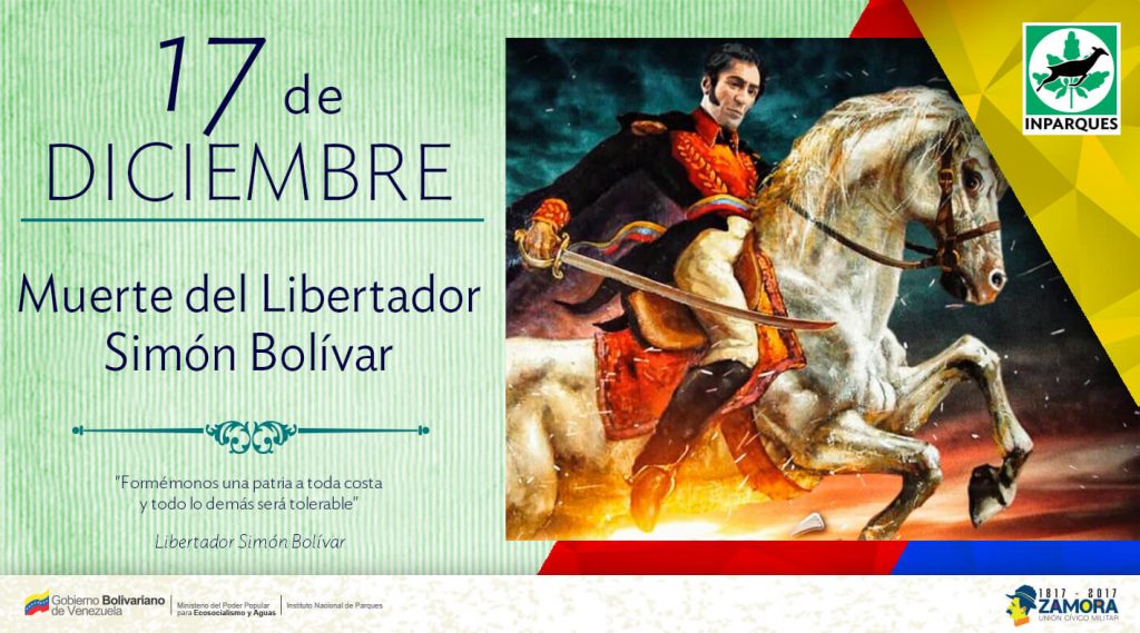 Prensa Ecosocialismo y Aguas (MInea) / Inparques / Caracas, 17/12/2017.- Simón José Antonio de la Santísima Trinidad Bolívar y Palacios, mejor conocido en Venezuela y el mundo como Simón Bolívar, el Padre de la Patria, entregó su vida a la causa de la independencia hasta su muerte el 17 de diciembre de 1830, hoy hace 187 años, fecha que conmemora el pueblo venezolano con un sentido homenaje a El Libertador.