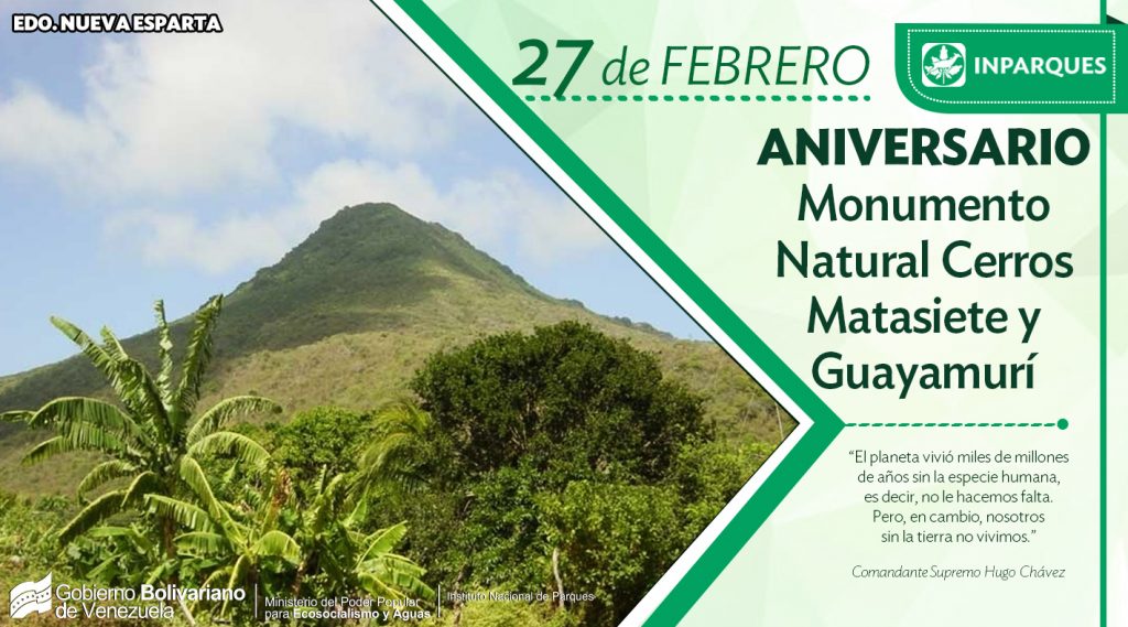 Prensa Inparques/Caracas, 27/02/2018.- El 27 febrero 1974, fue establecido como Monumento Natural Los Cerros Matasiete y Guayamurí, ubicado en la isla de Margarita estado de Nueva Esparta, para dar protección a un valioso conjunto de elementos de la naturaleza y del paisaje insular con características y atributos excepcionales.