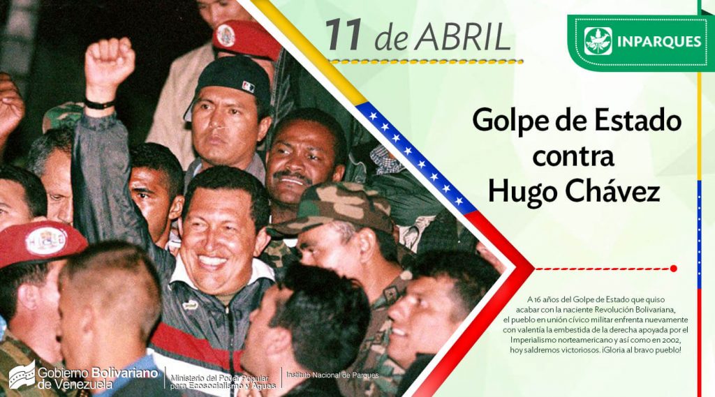 Prensa Ecosocialismo y Aguas (Minea) / Inparques / La Asunción, 09/04/2018.- El golpe de Estado consumado el 11 de abril de 2002 contra el gobierno legítimo y democrático del Presidente Hugo Rafael Chávez Frías fue un acontecimiento que puede ser narrado en tres actos: el antes, durante y después de una ofensiva mediática sin precedentes en el mundo, donde se buscó no solo legitimar internacionalmente una dictadura, sino condenar a sectores humildes de la sociedad sin ninguna averiguación seria ni creíble y secuestrar no solo a un presidente, sino a un gran líder de la Patria Grande.