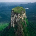 El Cerro Autana se eleva como una gigante torre sobre la selva del amazonas, semejante a una inmensa catedral de piedra surgiendo de la espesa llanura y coronada con una aureola verde que se funde con el cielo entre nubes generosas.